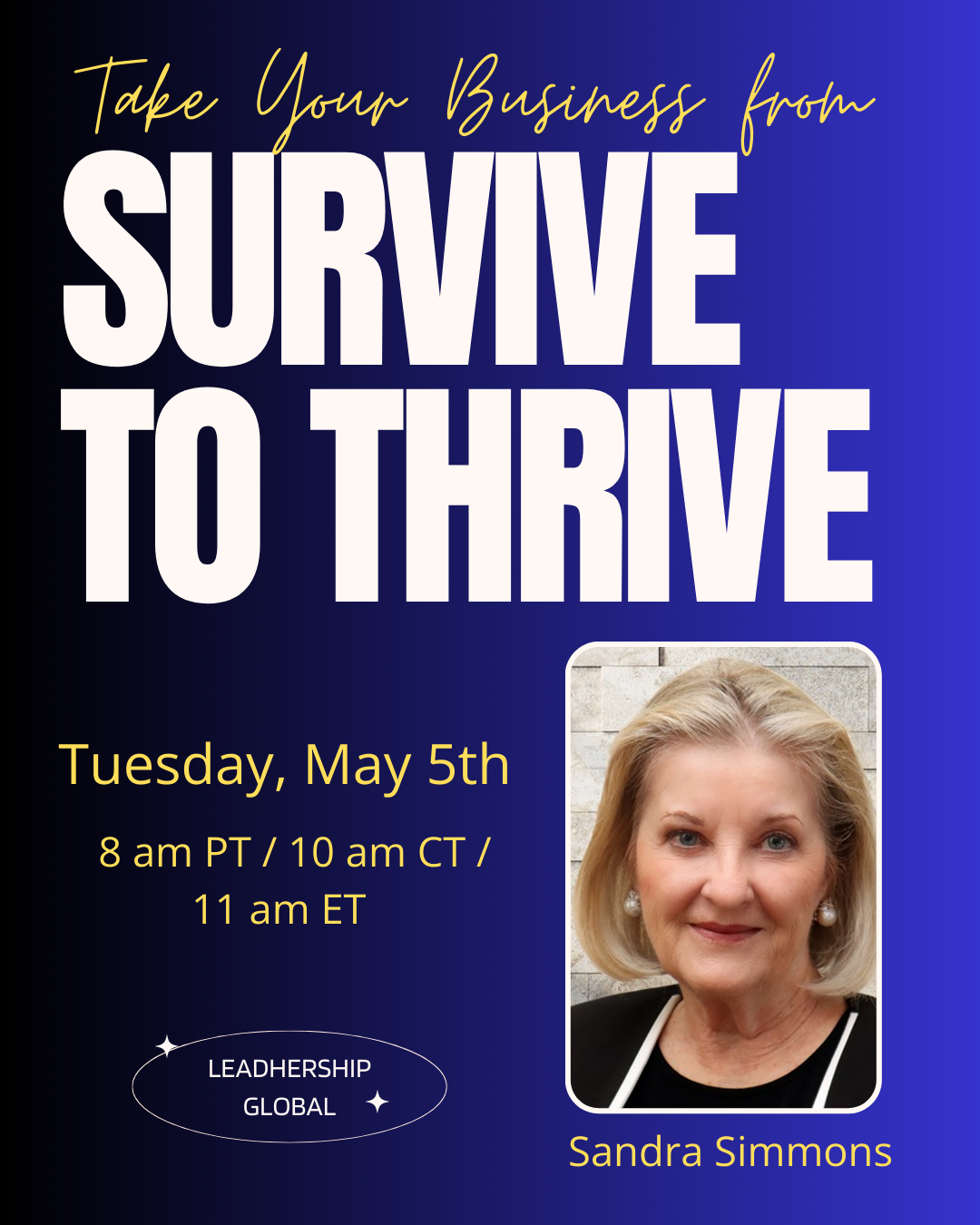 Take Your Business From Survive To Thrive - Your Roadmap To Financial Success Starts Here! Join this live presentation designed to elevate your financial success with Sandra Simmons! Discoer why you should run your company finances on cash flow management and how to create your revenue generation plan to meet your Income Planning Target - and more! This is a not-to-be-missed event!